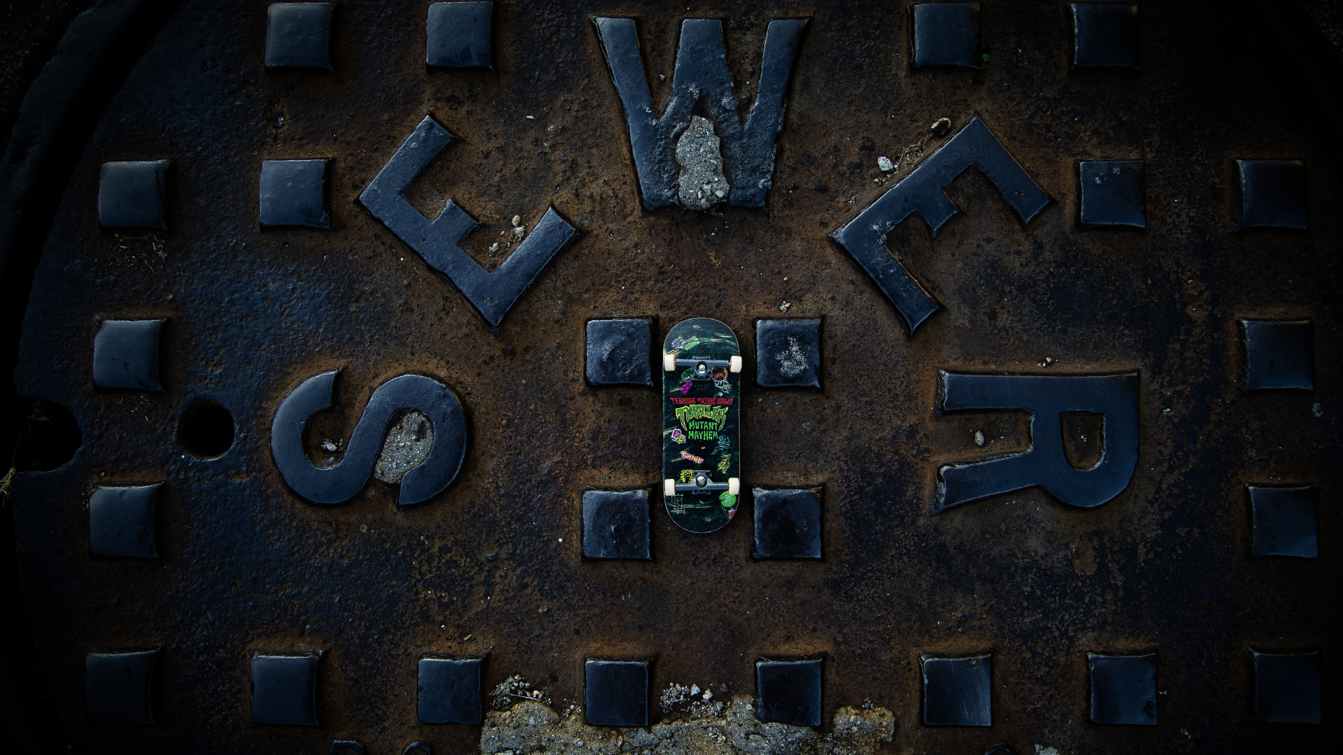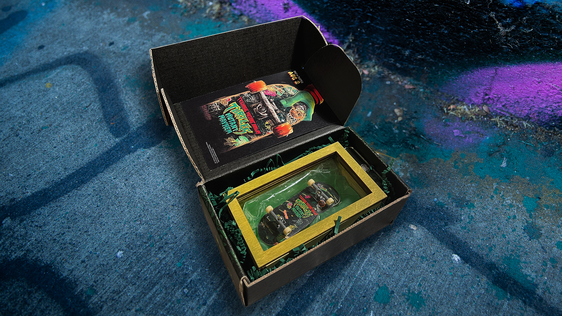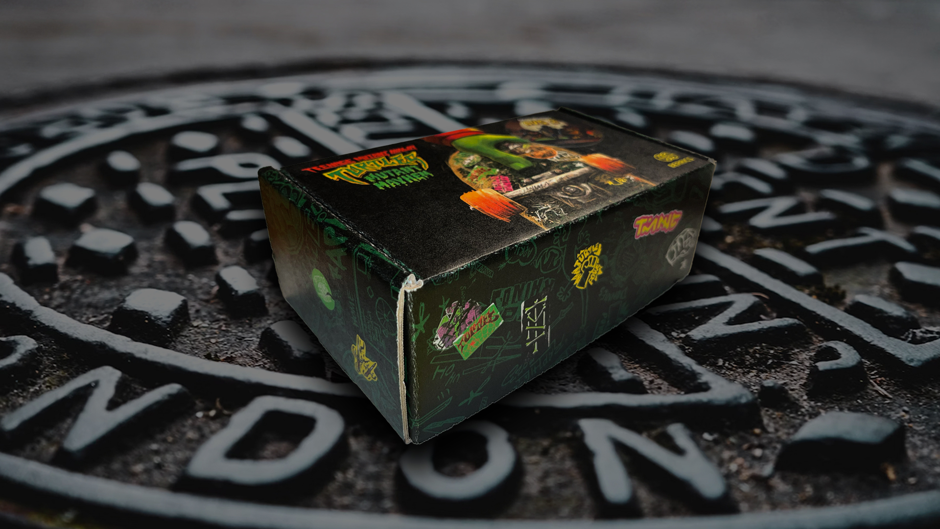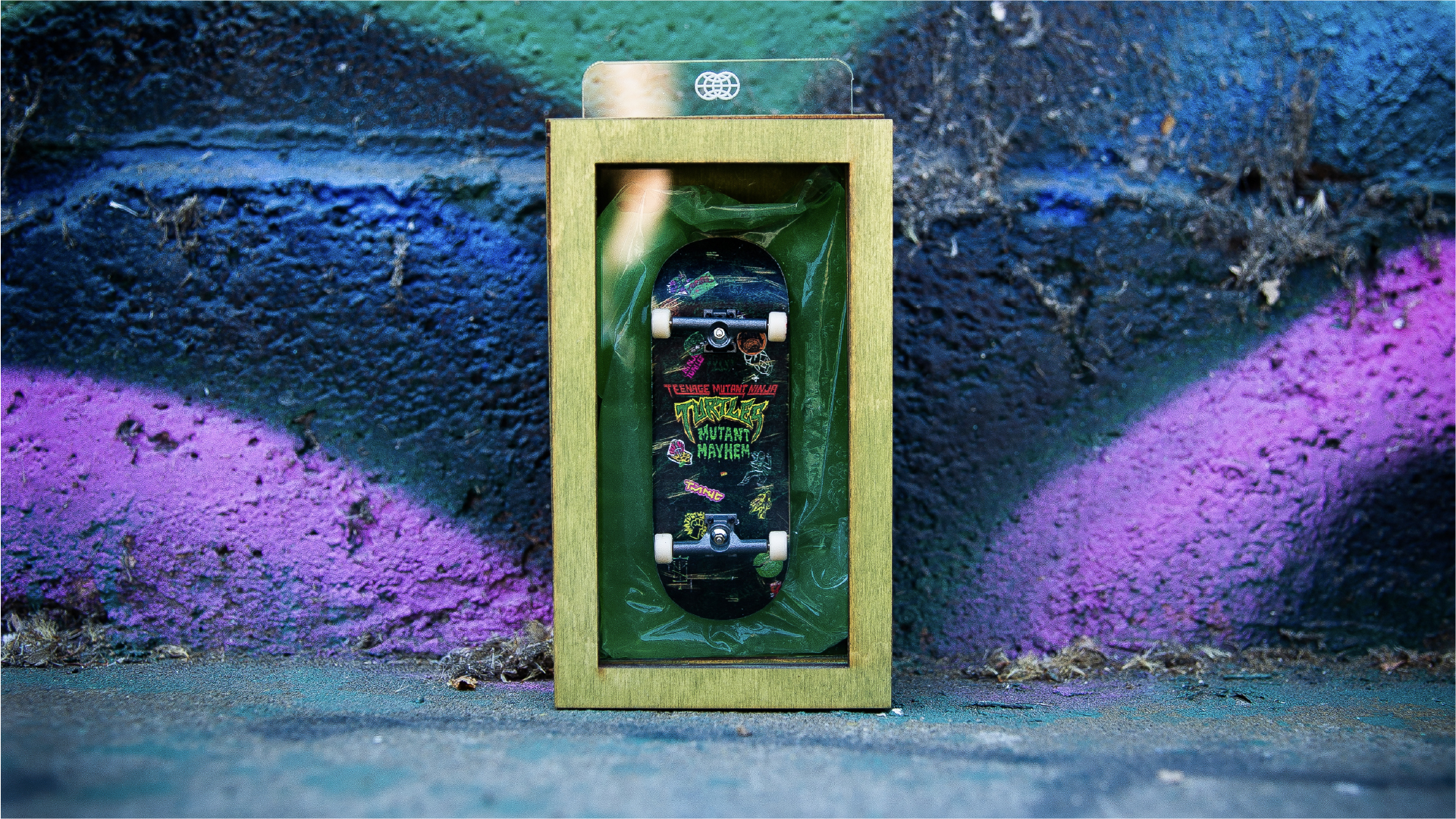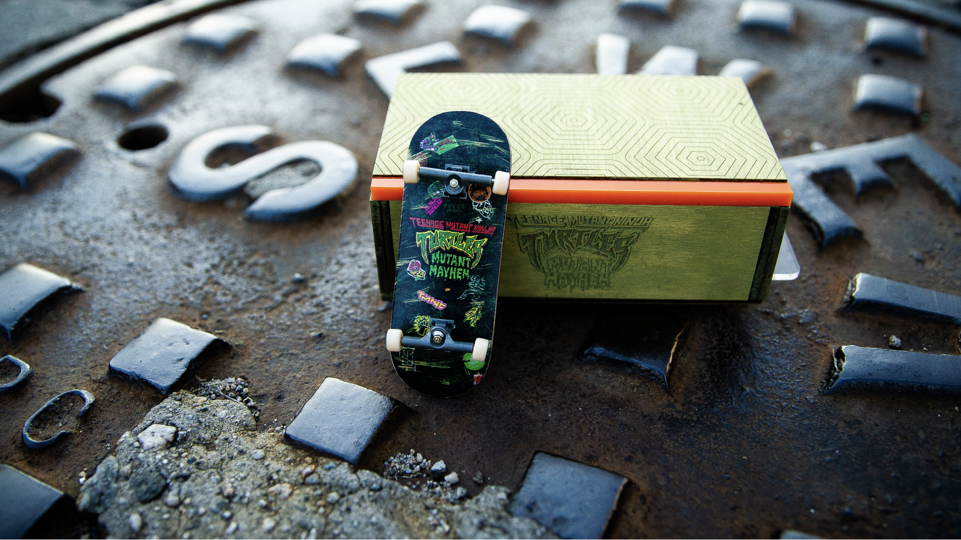 TMNT Mutant Mayhem logo by JJ Villard. Illustrations provided by Paramount. Fingerboard construction by Sorry for Fingerboarding. Wooden box/skate ledge by Moondust Studio Inc.